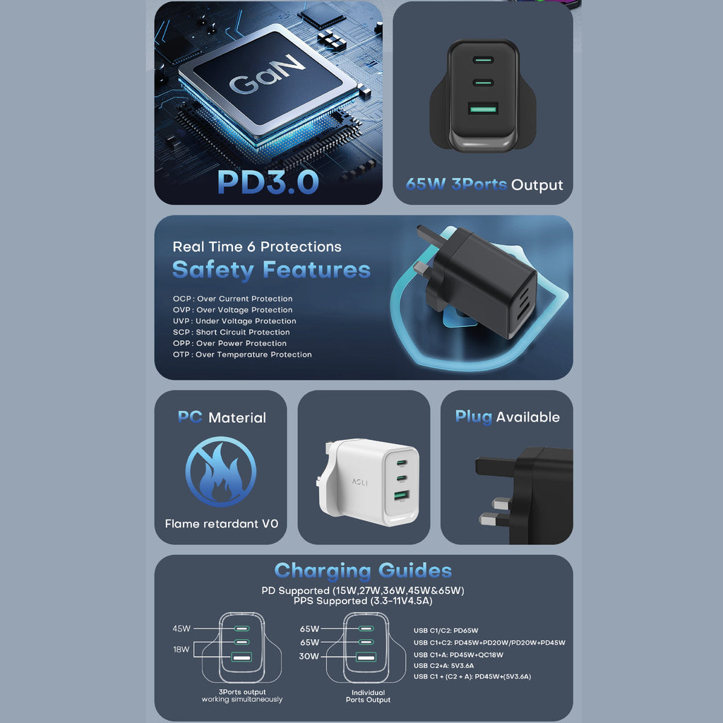 • GaN Technology: Enables superior heat dissipation and efficiency for smaller size and faster charging.