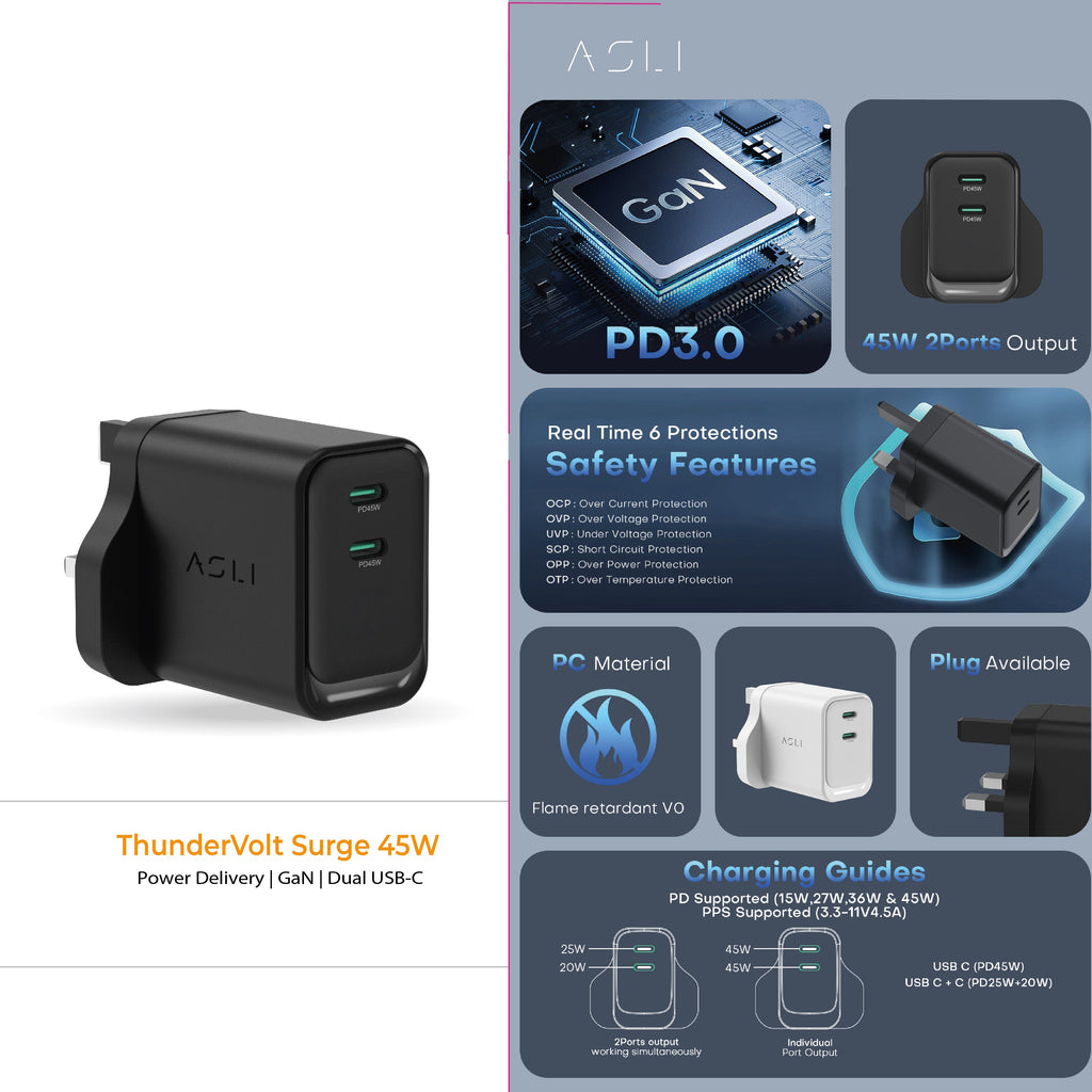 Asli Global ThunderVolt Surge 45W Power Delivery GaN Dual USB-C Charger | Black